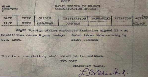 On 7 November 1918, Cook was the “chief radioman in charge of the wire room” [Naval Communication area] at US Navy Headquarters in Paris; Lieutenant Barler was the duty “communication officer”. During the afternoon [no time specified], Barler suddenly rushed into the wire room, handed Cook the message “Armistice signed eleven am, cease firing two pm, Sedan capitulated“, with Captain Jackson’s name on it, and told him “Get this off right away”.