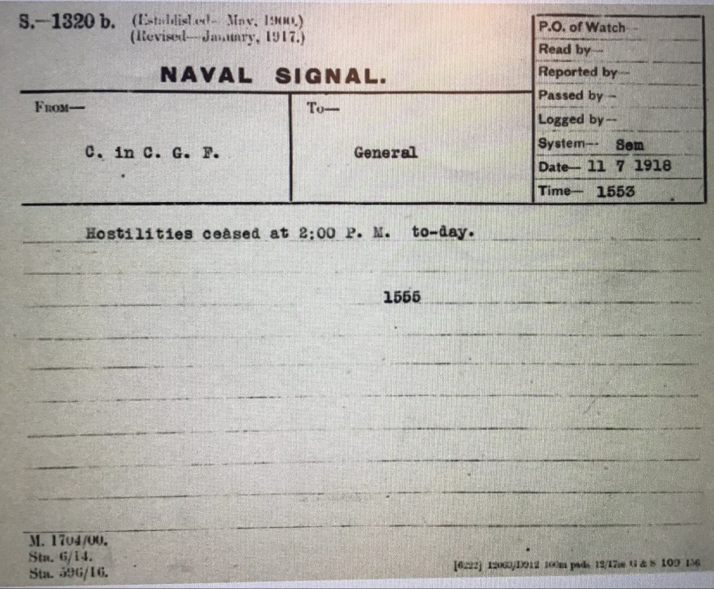 “Where the [false armistice] rumor started will always be a mystery. At the time of the circulation of the report, the writer happened to be at sea with the British Fleet. At some time in the forenoon a radio signal was received from the flagship of the fleet H. M. S. Lion, which in effect read, ‘Cease hostilities at 2:00 o’clock’ and which was signed by a British naval staff officer. There could be but one construction to place on this, and that was that Germany had capitulated. The officers upon the ship were discussing the message, copies of which had been posted in various messes, and debating whether they should open fire upon possible submarines after 2 o’clock, when the question was quickly settled for them by another message cancelling the previous one. The armistice had not been signed, although the two messages are proof that the Admiralty, for a very brief time, thought that it had. The rumor and the cancellation came very close together, so close that the newspaper men who had taken occasion to check up were disappointed almost at once.”34 (The times shown on the two signal sheets do not support the writer’s observations that they “came very close together” or that they were sent in the “forenoon” – they were afternoon signals.)