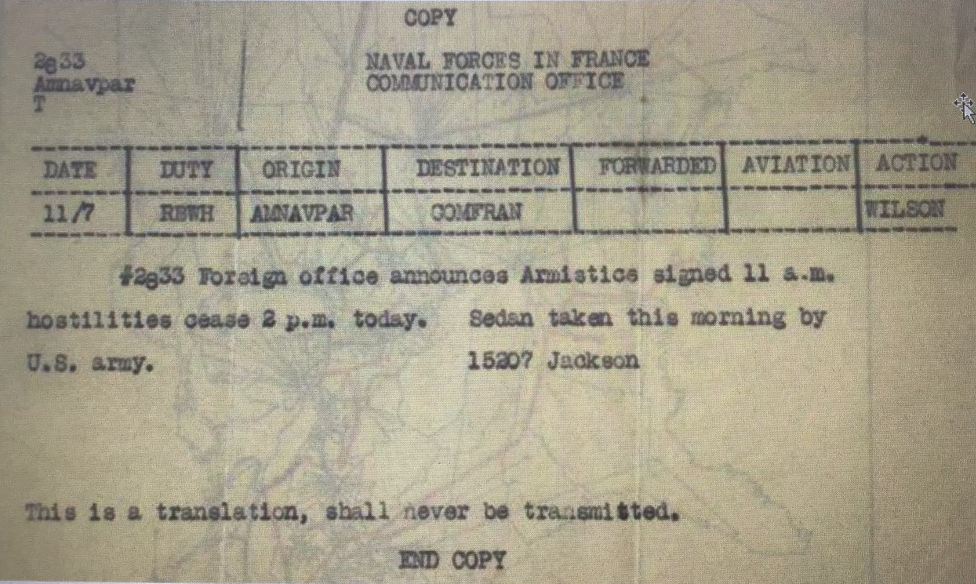 “15207” is the time and date notation for the telegram – 3:20 pm on the 7th (November 1918) – indicating when the content was originally released by “Jackson” for transmission from the Communication Office in the US Navy’s Paris Headquarters. (Admiral Wilson received the telegram in Brest sometime before 4:00 pm.)