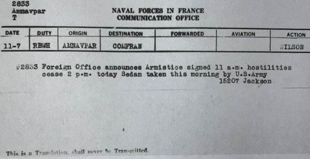 The “15207 Jackson” sign-off on the armistice message indicates that it had arrived at US Navy Headquarters in Paris sometime before 3:20 pm. Therefore, it must have arrived a little earlier than 3:20 pm at the American Embassy (before being telephoned from here to the Navy Headquarters), and even earlier at the French Foreign Ministry itself, but exactly when the French War Ministry sent out the information is not known.